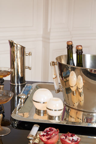 Handmade Nickel Silver Bucket with Natural Onyx Stone Handles. Serve your guests with unique style. This is a natural product, variation is to be expected. SELECT BETWEEN 4 COLORS AND 3 SIZES.