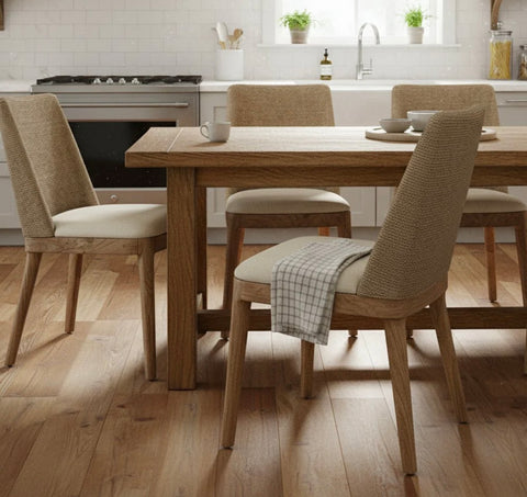 Enhance your dining experience with our Patton Tan Rope Woven Dining Chairs. Crafted with sturdy wood legs and a comfortable cream upholstered seat, these chairs offer both durability and style. The unique rope woven jute design adds a touch of texture to any dining room, making every meal feel like a special occasion. SET OF 2
